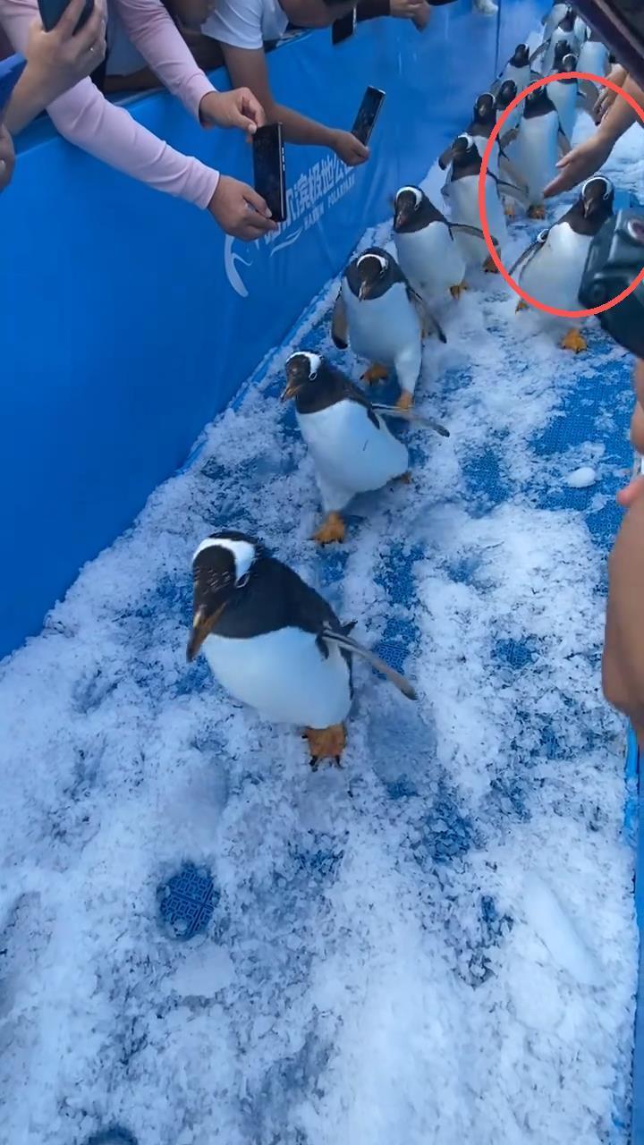 企业巡游中有游客伸手摸企鹅(视频截图)